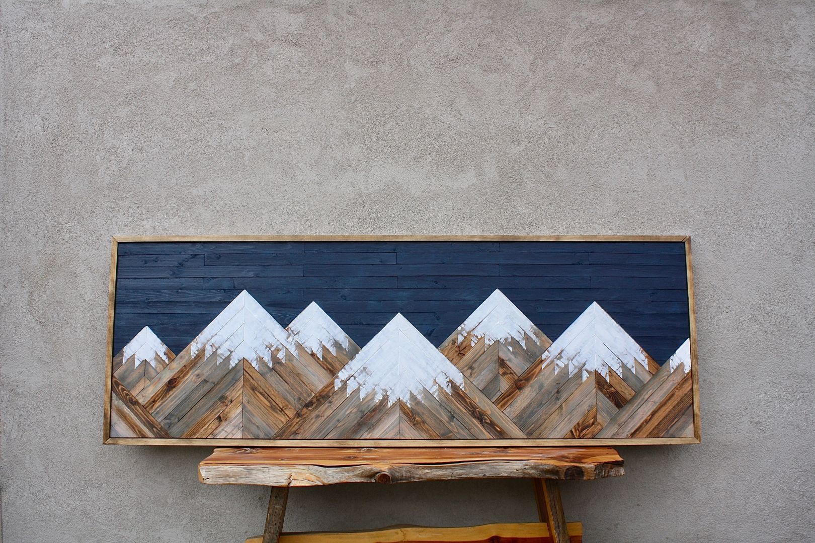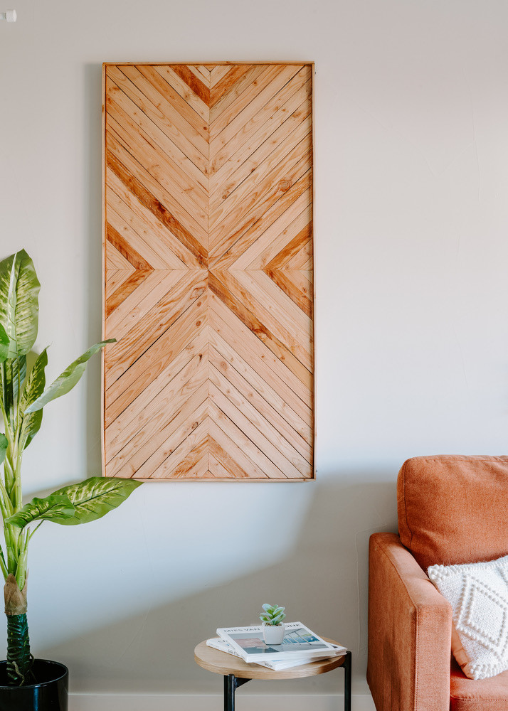 Little did I know, it really would end up being a wonderful gift. Years after college, I had just moved into an apartment with my now, husband to be, Eric. I wanted to fill up some wall space with a fun statement piece. I got inspired by wooden art and decided I would try to create something using an old frame and some extra wood I had acquired. On the living room floor, I used the side of an envelope to mark lines and eyeballed the angle of the cut. While Eric would cut pieces on our second story porch using a circular saw and a camping table (it doesn’t sound safe because it isn’t safe).