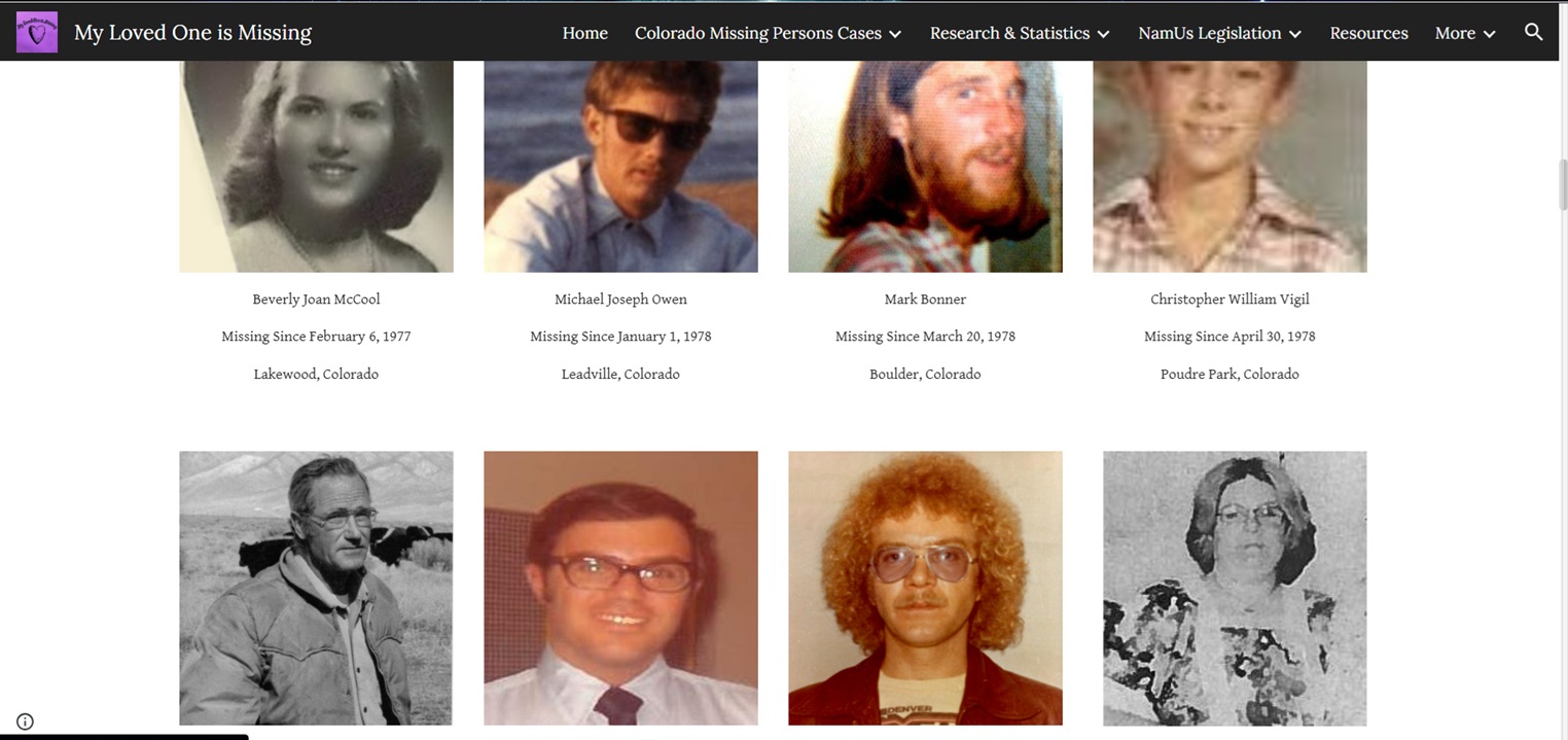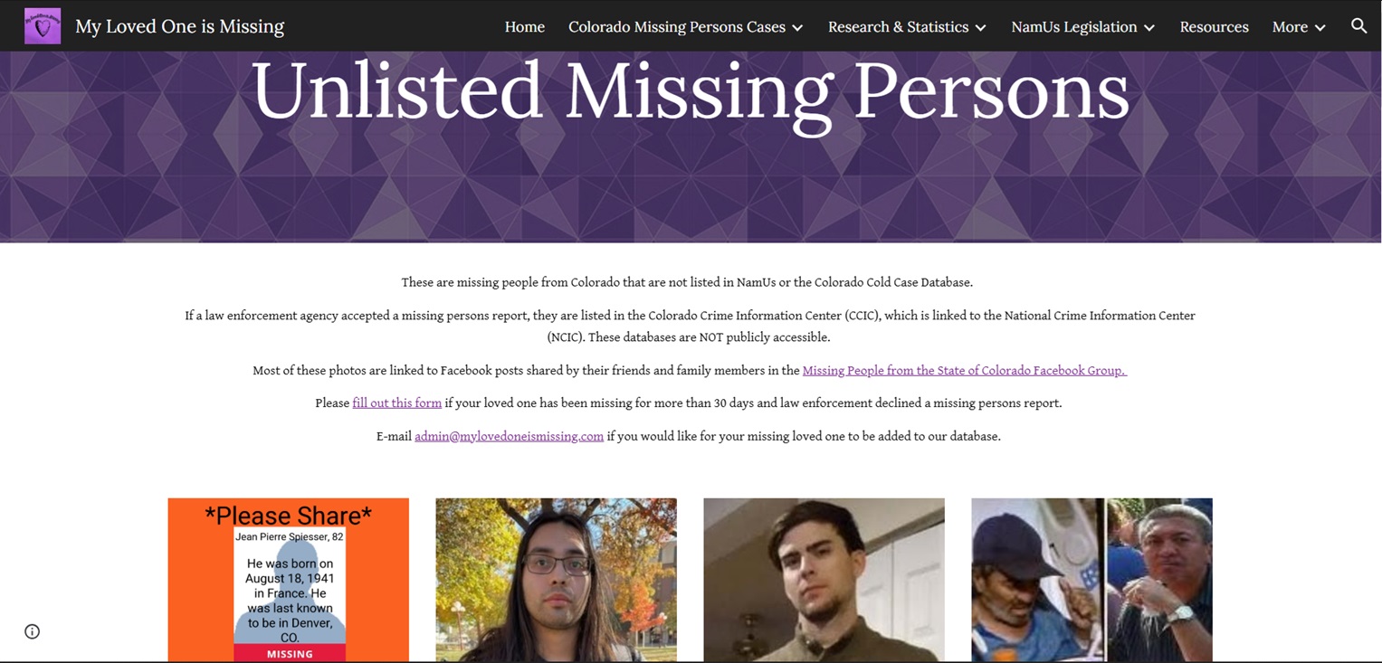While national databases like NamUs and the Charley Project exist, I have yet to find a comprehensive, Colorado-specific resource. The CBI’s Cold Case Database is limited, only including cases of individuals missing for over three years. Because Colorado lacks NamUs legislation, law enforcement agencies are not required to use the database, meaning many cases go unlisted. If law enforcement does not share a case on social media or enter it into NamUs, the missing person’s name may not be made public until the release of the annual Colorado missing persons list—one year after their disappearance. In many cases, a photo of the missing person is not available until three years later when the case is added to the CBI database, assuming a photo can be obtained. This gap in public awareness is unacceptable, and I am committed to ensuring these individuals are not forgotten.