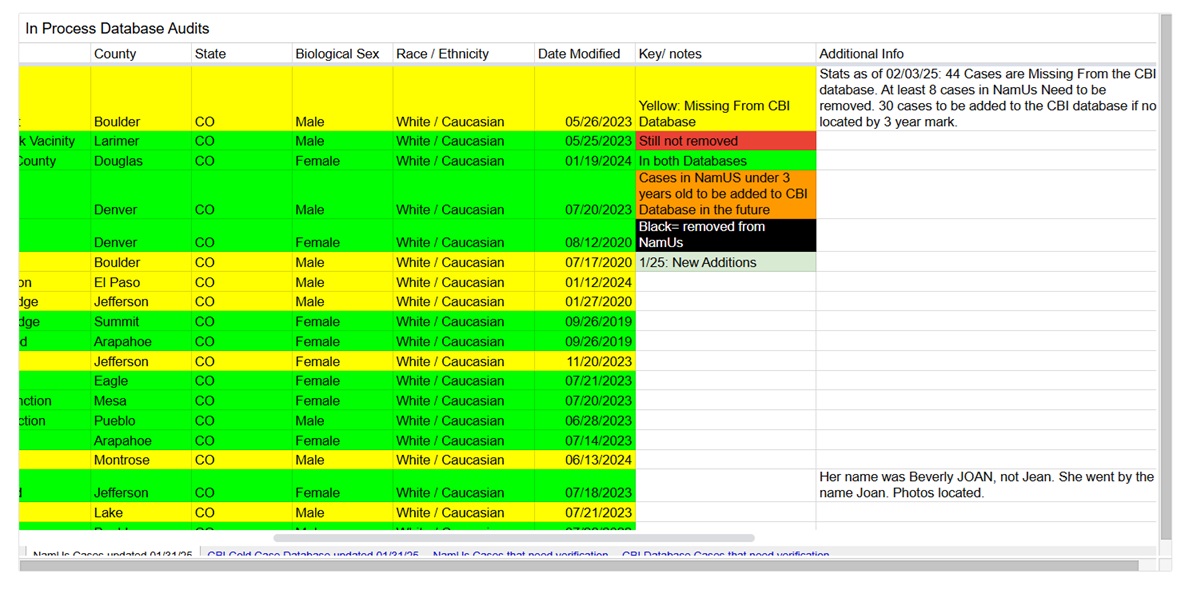 Unfortunately, as my health declined, I was no longer able to assist families in person. Rather than stepping away entirely, I shifted my focus to providing consulting services. I continue raising awareness for missing, unidentified, and unclaimed persons through my social media accounts while also working to ensure accuracy in public databases. This includes searching for and submitting missing case photos to NamUs and the CBI cold case database, as well as helping to get closed cases removed and unlisted cases properly documented. I also review the annual Colorado missing persons name list to ensure that no missing person is forgotten, and names of people who were located are removed from this list.