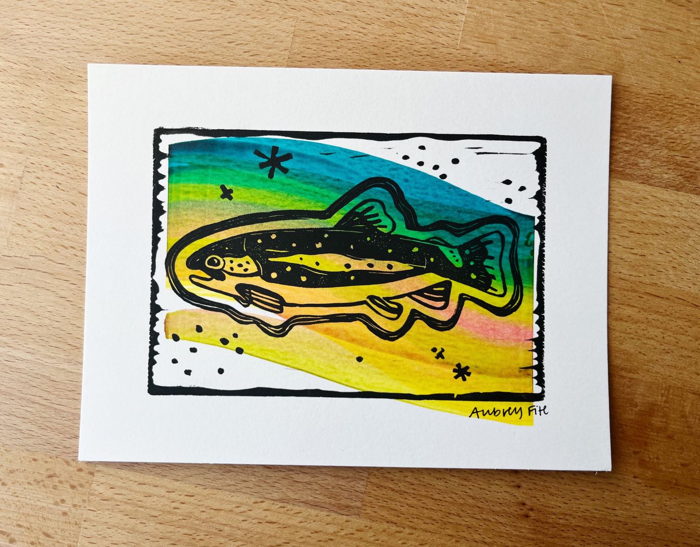 For the most part, I am a self-taught artist. I took two years of Art in high school, but haven’t studied art traditionally since. I rely on resources like YouTube, Skillshare, and even TikTok to pick up new skills. My artwork started out as mostly digital and has grown to using a variety of mediums over the years. I was missing the hands-on messiness that traditional mediums allowed and I quickly took up block printing. I dove into video tutorials, bought a Speedball kit, and just went for it! The rainbow trout prints on my site were created from the first block I ever carved. Since then, I’ve played with gouache painting and introduced screen printing into my mix. Screen printing has definitely been the most rewarding; the process is tedious, but the payoff is huge.