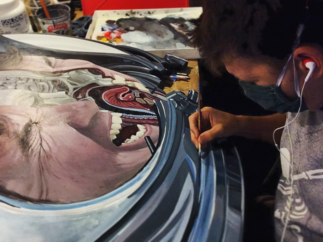 The past 3-4 years has seen a slight shift into more contemplative works, compared to earlier works that were pure entertainment (at least for me). My favorite way to present art recently has been to cut out a big MDF panel and gesso/paint on that, then cover in resin so it’s shiny, and then hang that on the wall. I did a big series of self-portraits in 2020 as a culmination of some self-discoveries / self-examinations (literally looking into my brain), which were sort of scary to put out into the world, but getting to look back at myself (my big, shiny self), I got a new perspective on big life things. So my art has also been shifting into the existential / self-revealing realm, which is also very therapeutic! I’m still exploring ideas in watercolors, pen & pencil, and linocut prints as well.