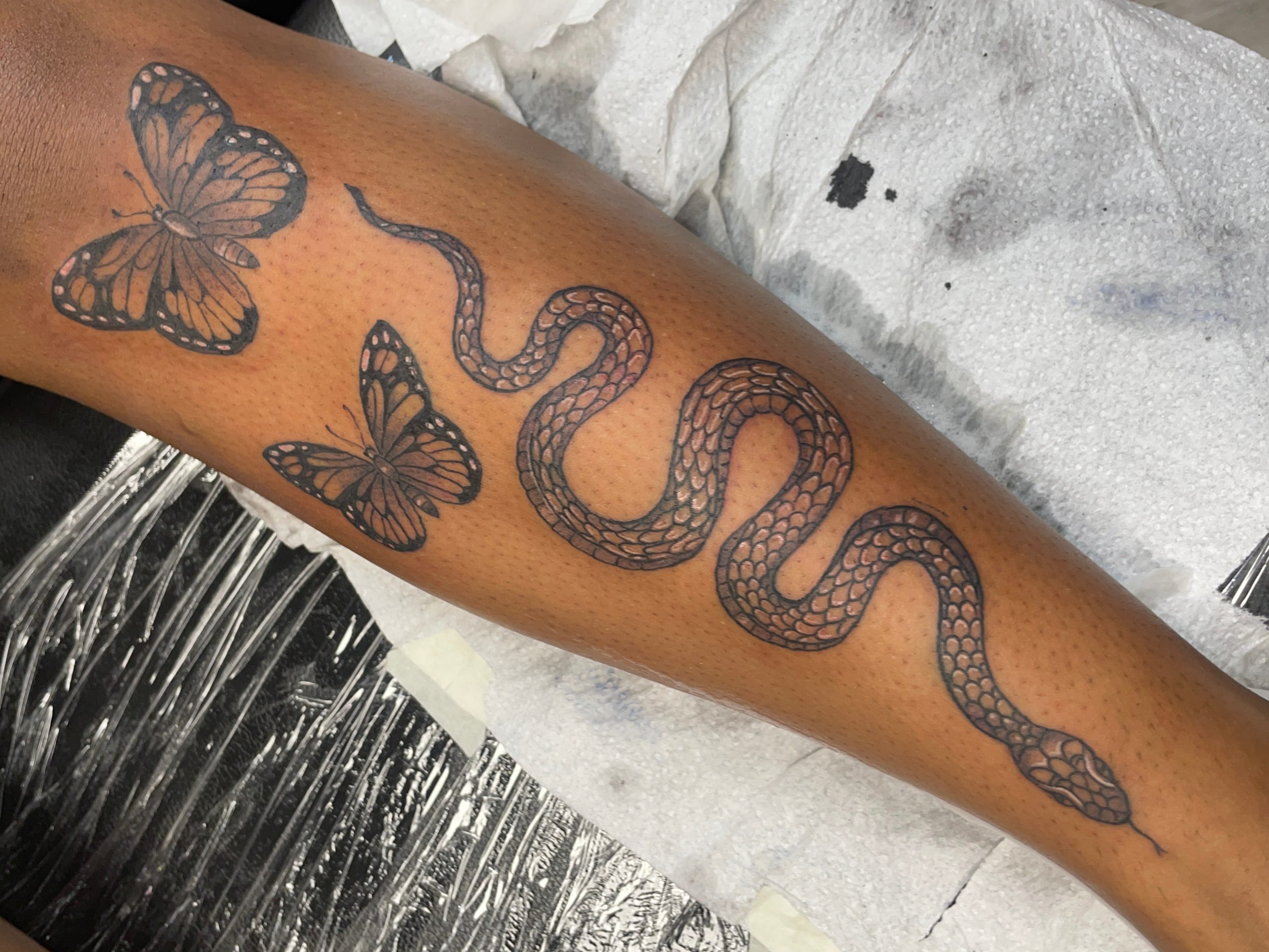 I’m most proud of how far I’ve already come. Like most people I have a 5 year plan for my business and I ended up achieving those goals within 3 and a half years. Getting to where I am today, in my own studio fully licensed, was not easy. I had to put in hours of studying, practicing on fruits f*ke skins, dolls myself, having to learn what every piece of equipment was and how to use it properly. Comparing my work to others daily, drawing on paper everyday and trying to think of new designs/ ideas. Something’s I’ve learned along the way is that this career isn’t a marathon it’s a walk, you definitely have to stay encouraged and always practice! It can take years to get comfortable with it but as long as you take it one day at a time you’ll always see progress. Tattoos aren’t just fun images on your body, they tell a story, and I want to help people tell their stories. I learn so much about my clients and the pieces they get and each of them have some meaning that always sticks with me.