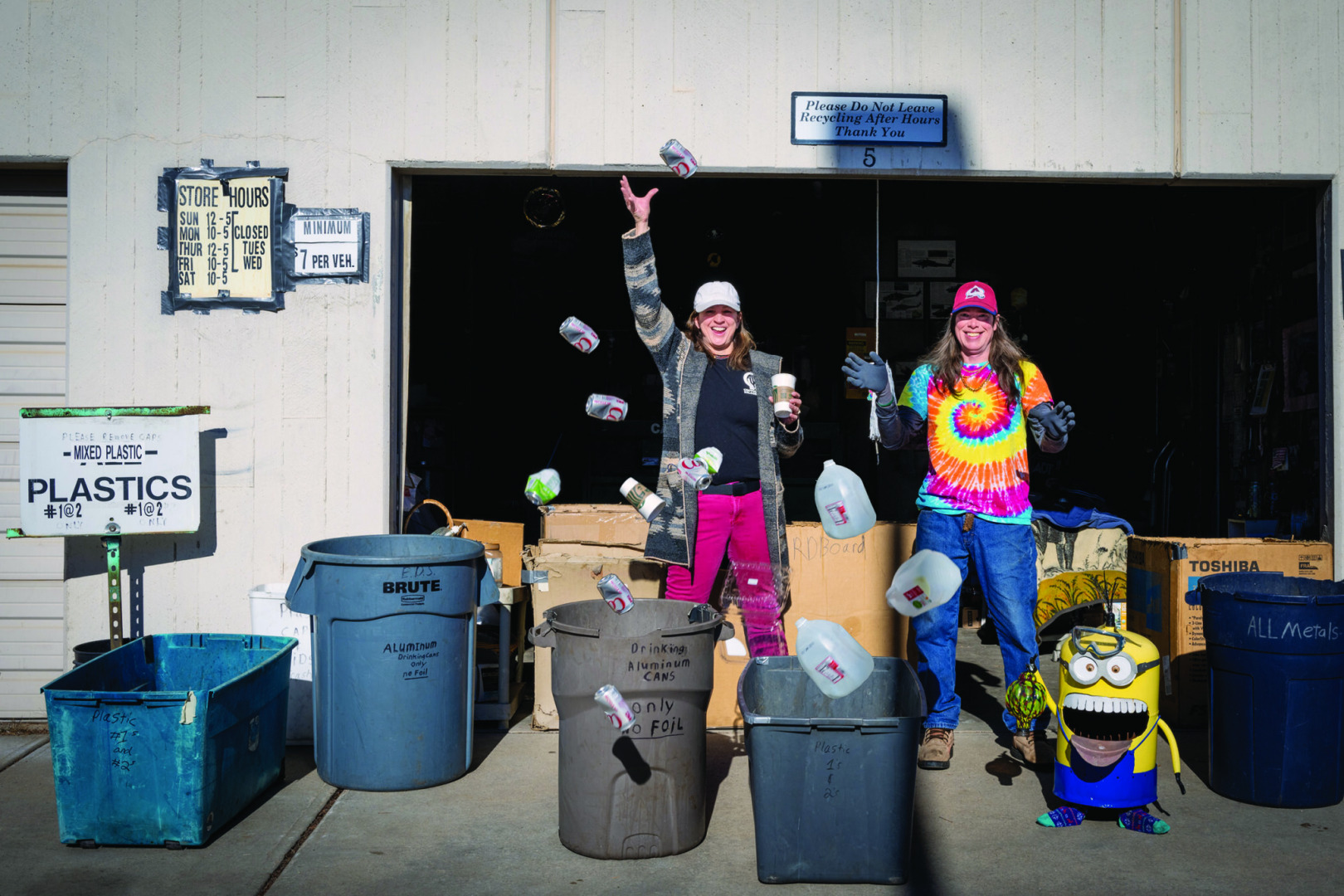 Ellen Nelson – Picture of Megan & Steve (Foothills Recycling Employee) tossing recycling cans