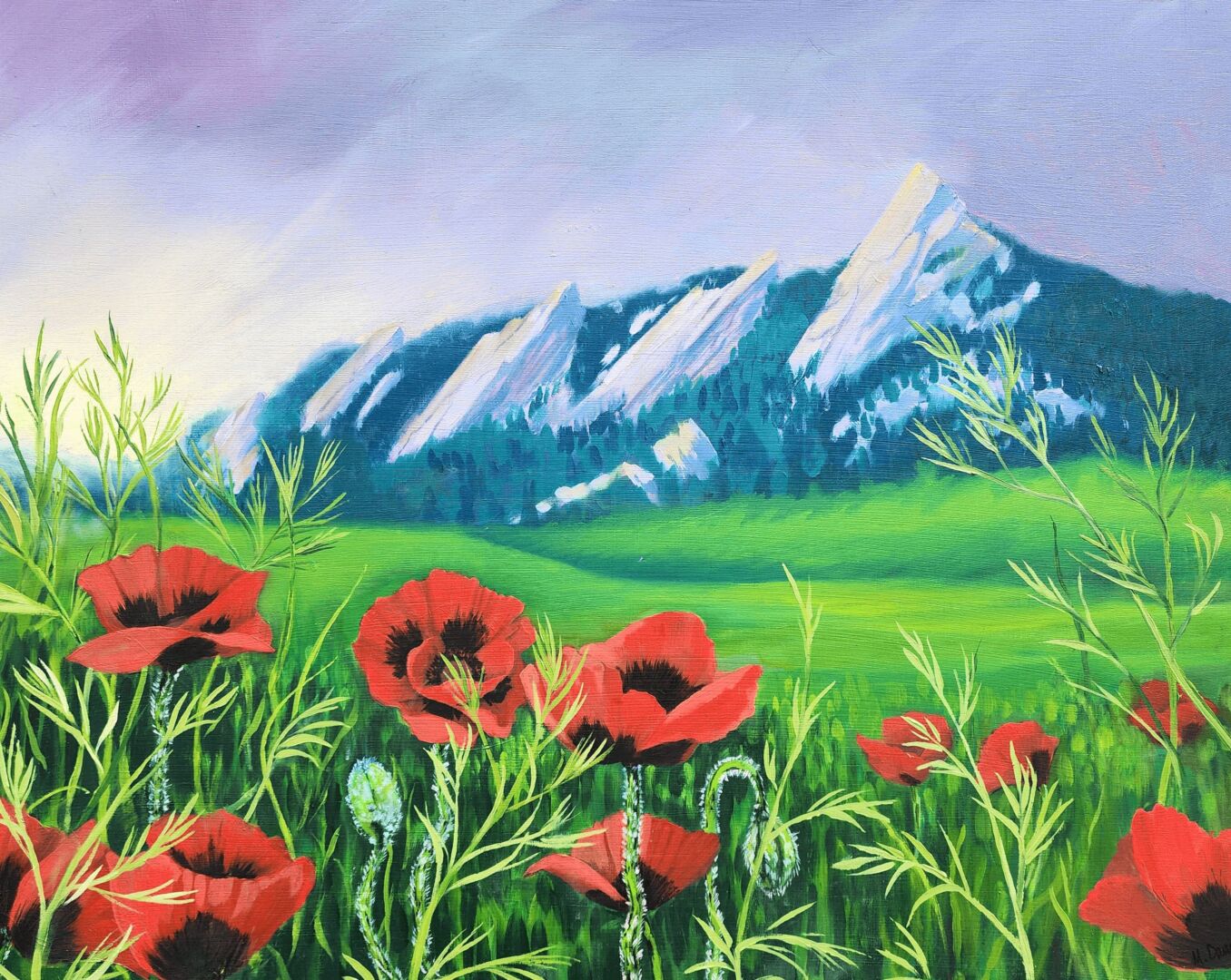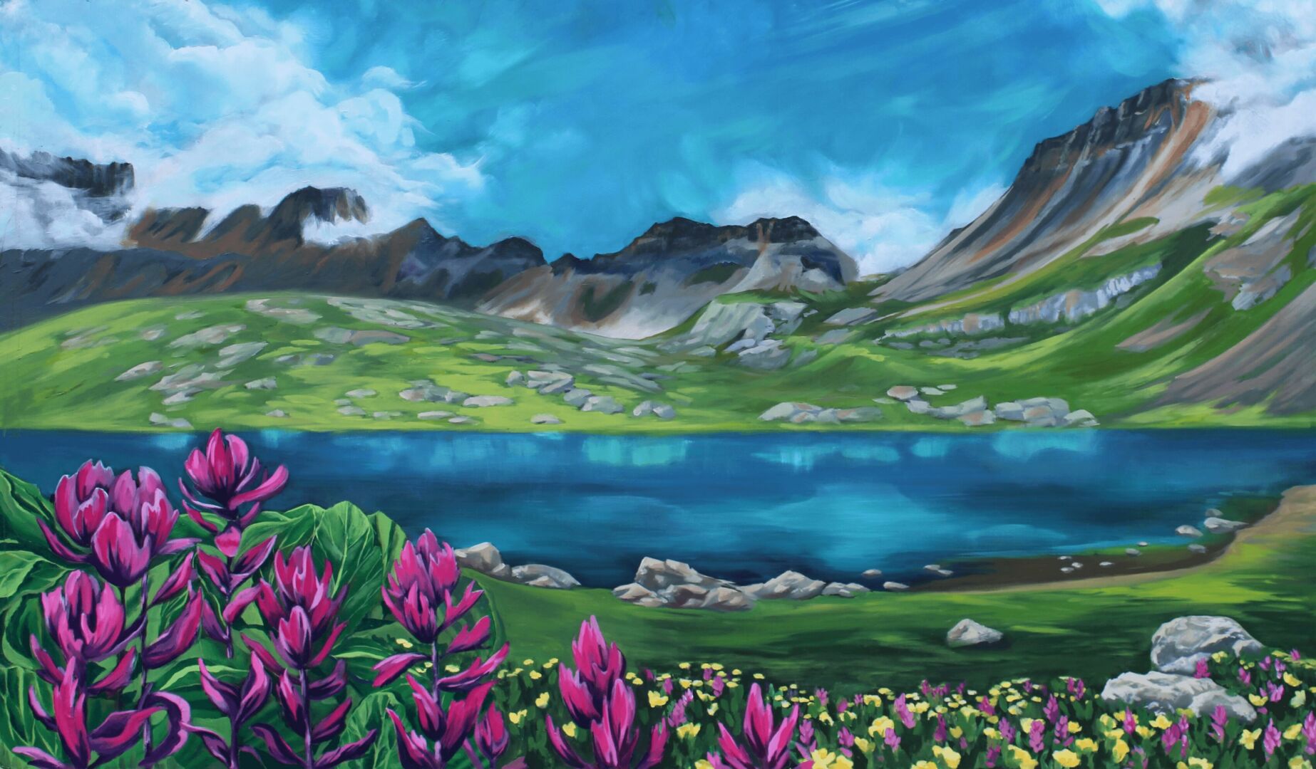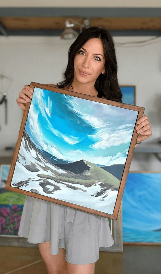 If you’ve ever been on a hike with me, you’ve seen me lose my mind over landscapes; the colors, depth, wildflowers, and mountain peaks. Don’t even get me started on clouds. My paintings reflect my obsession for reimagining, recreating, and dramatizing the gorgeous landscapes I have experienced. I want to share how calm and fulfilling those landscapes made me feel, especially knowing, most people aren’t willing or able to travel to such remote spots.