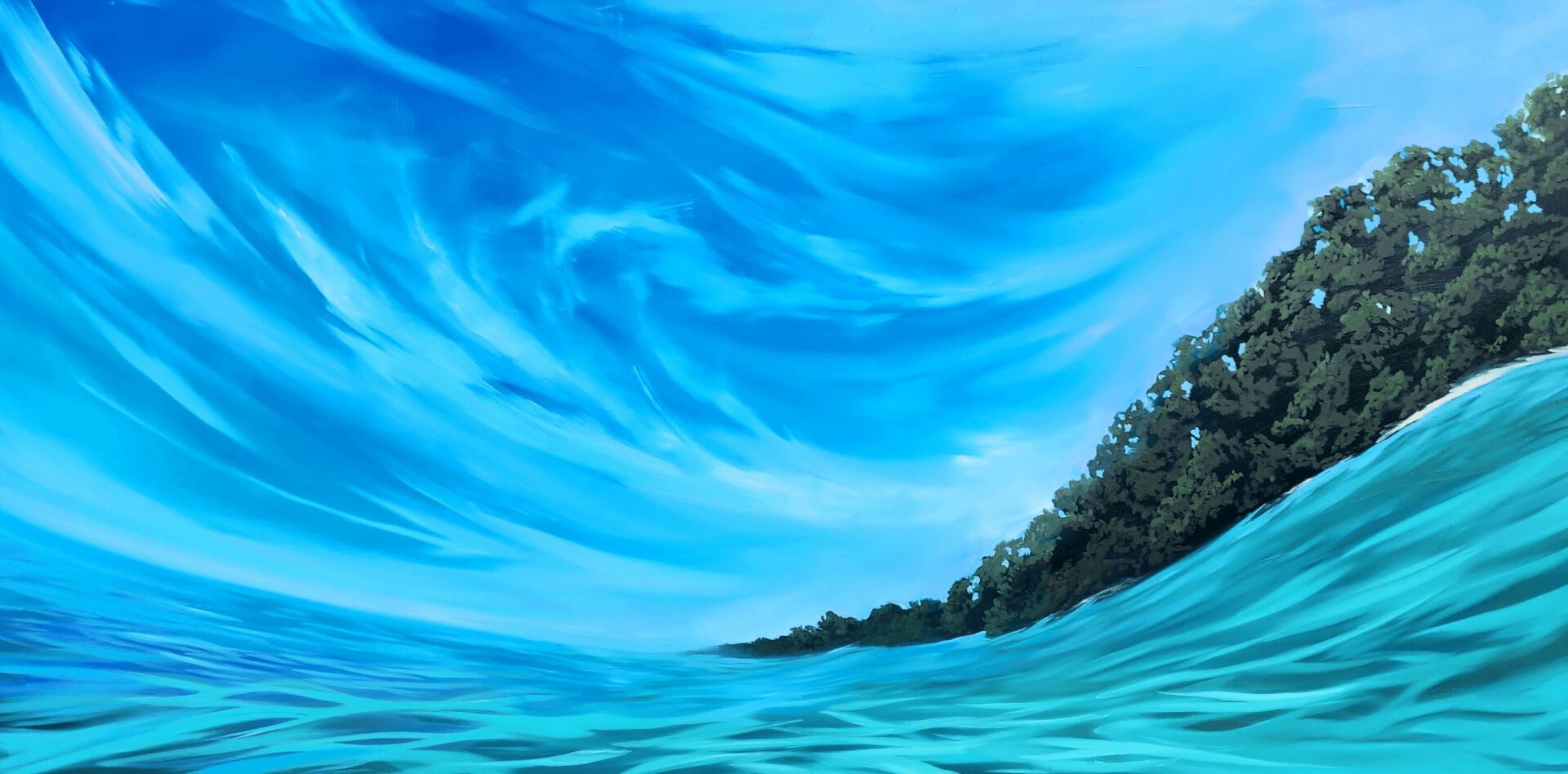 I love to dramatize my landscapes by painting them large, sometimes warping the lines to create movement, adding sweeping clouds, and exaggerating the colors to match my memories.