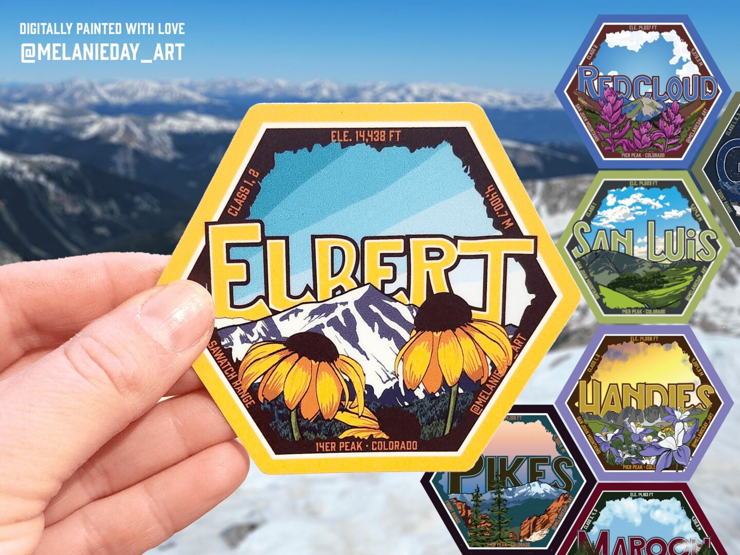 Aside from my oil paintings, I have taken on a passion project to create digitally illustrated designs for all of the 14er peaks. I have 15 stickers currently being sold nationwide, and will eventually have illustrations for all 58 peaks in Colorado. Pikes Peak, not surprisingly, has been my top seller.
