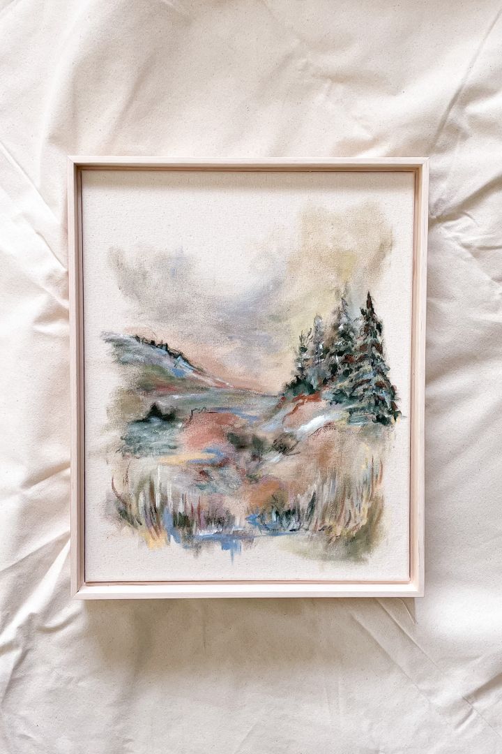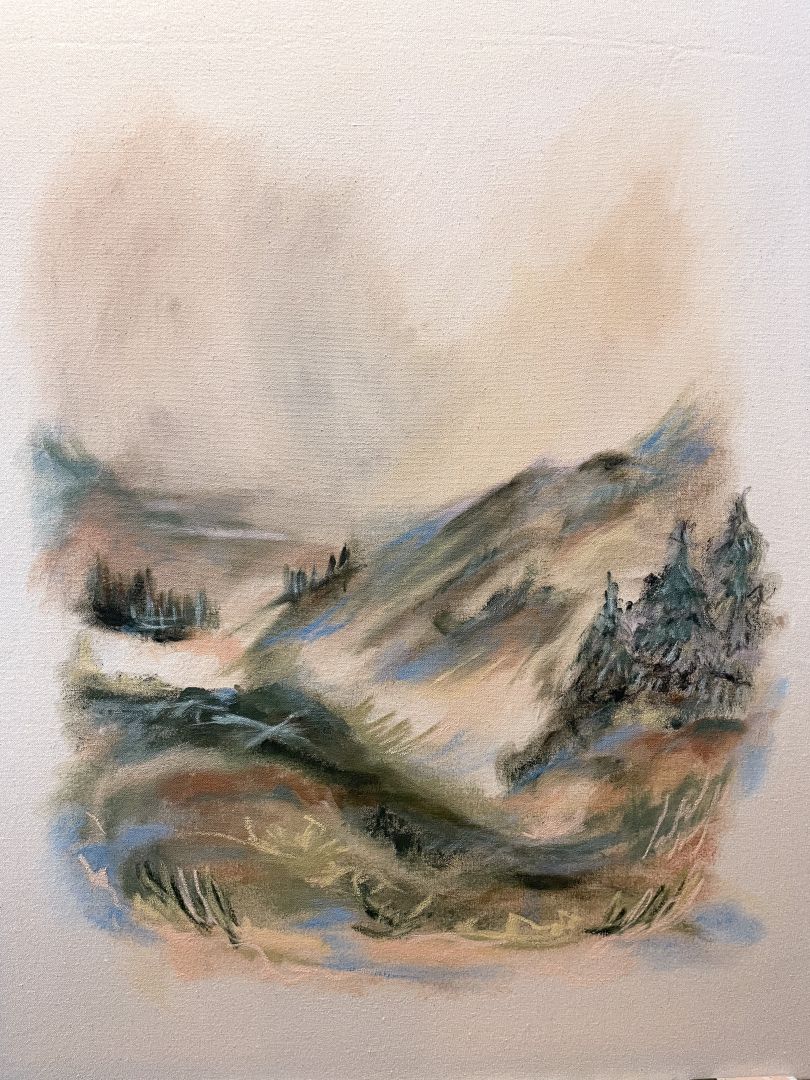 Growing up in Denver, it’s hard not to picture the mountains when I begin a painting. I love creating more impressionistic mountain scenes with blocks of color next to one another. I also love the tactile nature of drawing and will often add embellishment of both line and texture as well. When my youngest was still an infant, I mainly worked in watercolor because it is easy to pick up and put down without much clean up, but as he grew and I had a more predictability in my day I moved onto oils and acrylic and have settled on a combination of thereof usually on raw canvas.