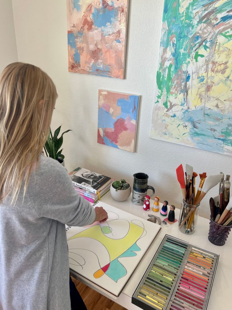 My art story begins at age 4 when I decided that my bedroom wall was the grandest canvas I had laid eyes on. I took to it with vigor, and stood back to admire my masterpiece, my first abstract painting. My mother, a repressed artist herself, was unimpressed and my beautiful work had vanished by the next day. My father was very inventive in the mechanical engineering world and it was because of him that I was quietly encouraged to follow some of my creative pursuits. Before I had fully recognized how critical art was to me, I studied Italian portraiture with sculptor Theresa Brownback, aerial dance with Nancy Smith, and designed clothing and styled my close friends. While traveling in Norway with my mom we would go to galleries and museums. A chronic migraine sufferer, I noticed my headaches would disappear while taking in works by Picasso, Miro, and Munch. It would be some time before I could realize my innate drive to paint. A decade later, I frequently visited the Denver Art Museum. It became a normal occurrence that I would walk into an exhibit or gallery and be so overcome with emotion that I would start crying. At the Fritz Scholder exhibit at the DAM, I was so touched by his work that I knew I had to explore this part of myself in greater depth. I yearned to paint but did not know where to begin. I had looked at the DAM’s offering of courses but the schedule didn’t work with my job. I decided to call the instructor directly, and am so fortunate that Chuck Ceraso took me under his wing as a private student. He taught me first to see, then to draw, and said I must paint. Chuck is a talented and unique instructor who learned color seeing from Henry Hensche, an American painter who was taught color seeing by Charles Hawthorne who was influenced directly by Claude Monet. Chuck taught me to see color and color relationships in this tradition, and continues to mentor me on this path. It was at the Women of Abstract Expressionism show at the DAM that abstraction chose me. The abstract paintings touched something deep inside of me and I felt their aliveness. I would look at the paintings for hours, returning at least 8 times to take them in, being shuffled out at the very last minute of the last day of the exhibit, in tears. When I told my father I was painting, he exclaimed “You’ve always been an artist!” My husband Matt and my girls have been endlessly patient as I insist on going to shows and galleries anywhere we visit and listen to my excitement about painting. Shoutout to Matt, who endlessly supports me in my art, Chuck, my father, and my friends and family who have all led the charge to encourage my painting.