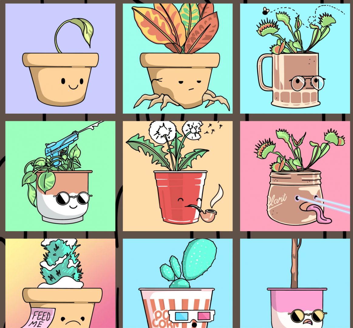 I have by no means “made it” yet. I am young, about a year out of my bachelors degree in Graphic Design. In my last year of school, I started a small business that creates travel poster designs for small towns around the country. This allowed me to spend a good amount of my time fresh out of college on the road exploring new states and new towns. The business is growing slowly though and it is not sufficient to pay all of my bills, but I am excited about what it could hold in the future. It has been quite a challenge, I work 6/7 days a week, with a few of those days each week easily being 12-16 hour days. I have also had to take on a part time job to build my savings back up. This year though has been the most incredible year for me to just have an adventure and experience life and learning in the real world. My art has grown more in this year then it did through a good amount of my collective artistic education. My artistic style is developing faster than it has at any other point in my life because I have been creating and exploring art on an almost constant basis. A year ago, I simply loved travel poster designs, especially those in similar styles to the WPA national park posters of the 1930s, and that made it such a joy to learn and develop my own vintage travel poster style. More recently I have been exploring the incredible world of NFTs and I have devoted most of the last couple of month to creating a collection that was just announced in late February 2022. It’s called Plant Pals Greenhouse.