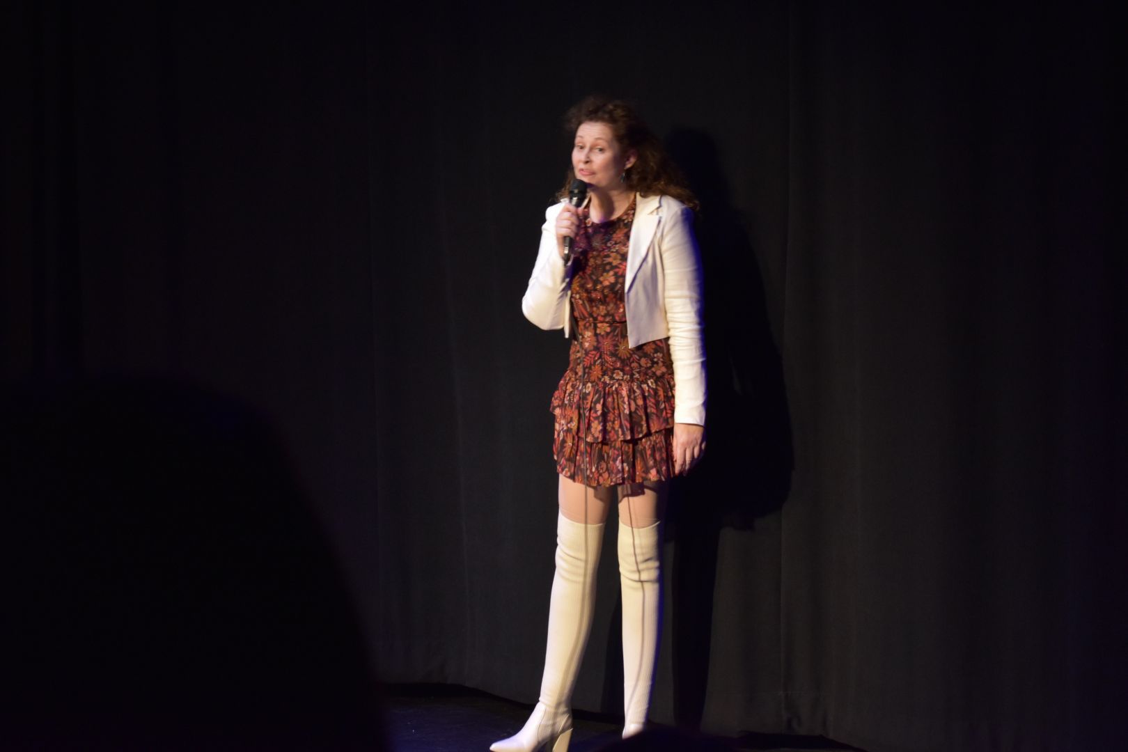 Ashley Ware for image standing with black background with white shoes