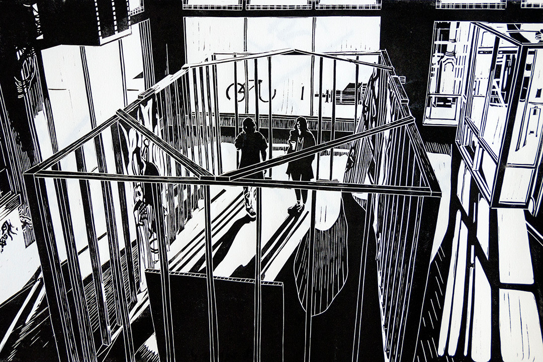 Most of the art I’ve shown in recent years has been linocut printmaking. It’s a simple and beautiful medium that you can do a lot with. Lately I’ve been playing around with art zines, collaging, and modular compositions – all based on linocut prints. In general, I love the reproducibility and affordability of printmaking. I love that each print is essentially an original piece because no print ever comes out exactly the same. I love the tangibility of it: feeling the texture of the paper in your hands, smelling the ink, the subtle way the oils in the ink shine in sunlight. As many times as I’ve done it, everytime I pull a print for the first time, it’s like magic for me – I’m always surprised that it works. And the biggest linocut lesson: if you can carve it, you can print it!
